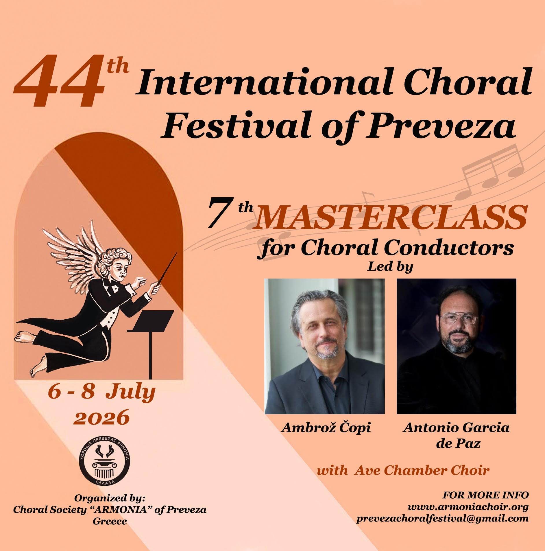 The International Choral Festival of Preveza invites choral conductors to a three-day intensive masterclass built around real rehearsal practice. In collaboration with the Ave Chamber Choir, participants will work directly with a distinguished ensemble, exploring conducting technique, musical interpretation, and communication in a practical and focused environment.